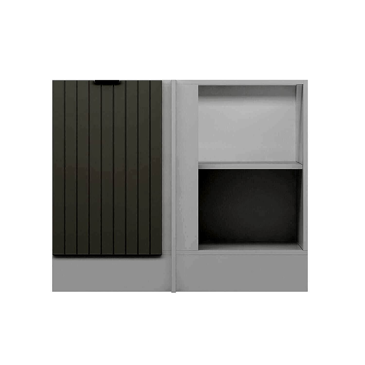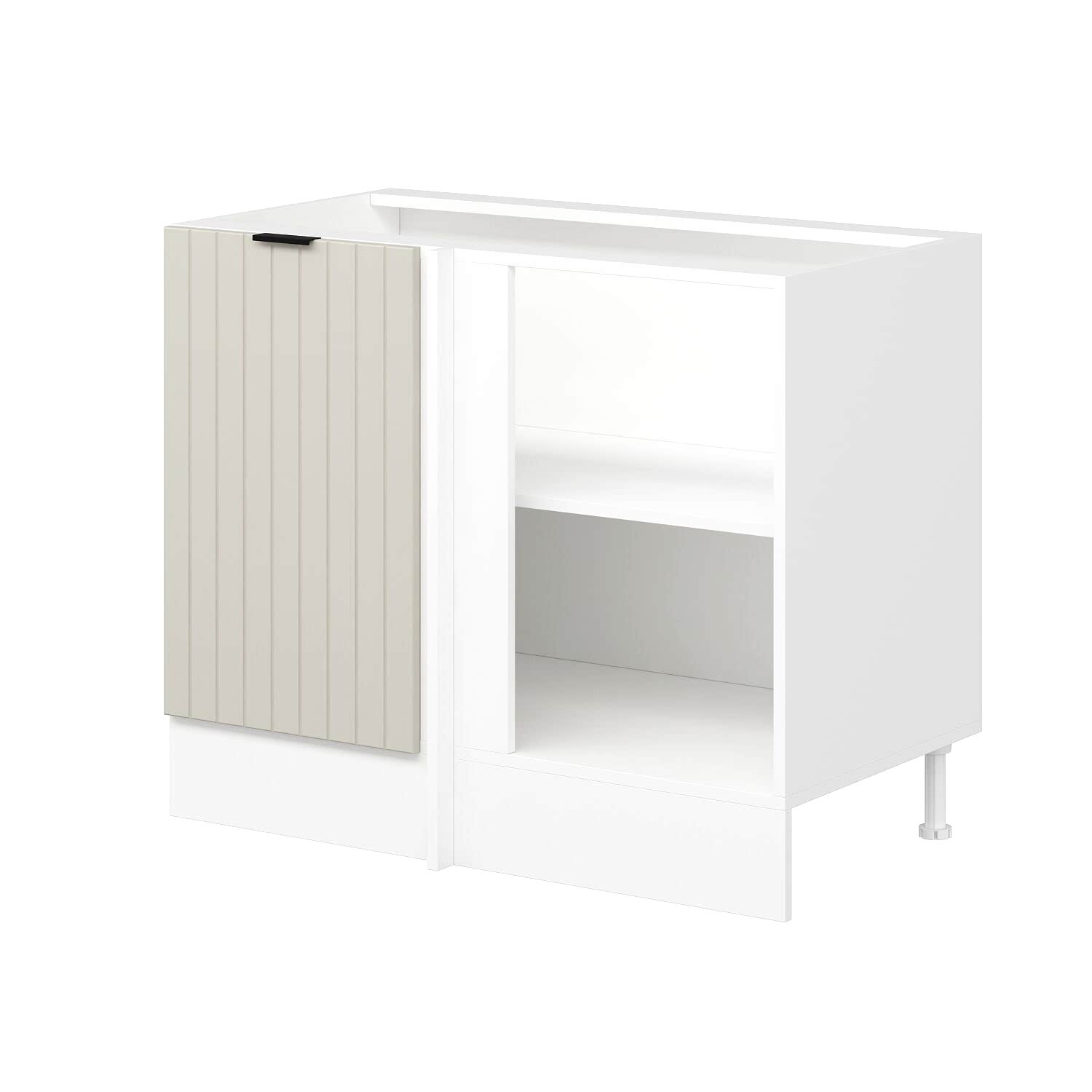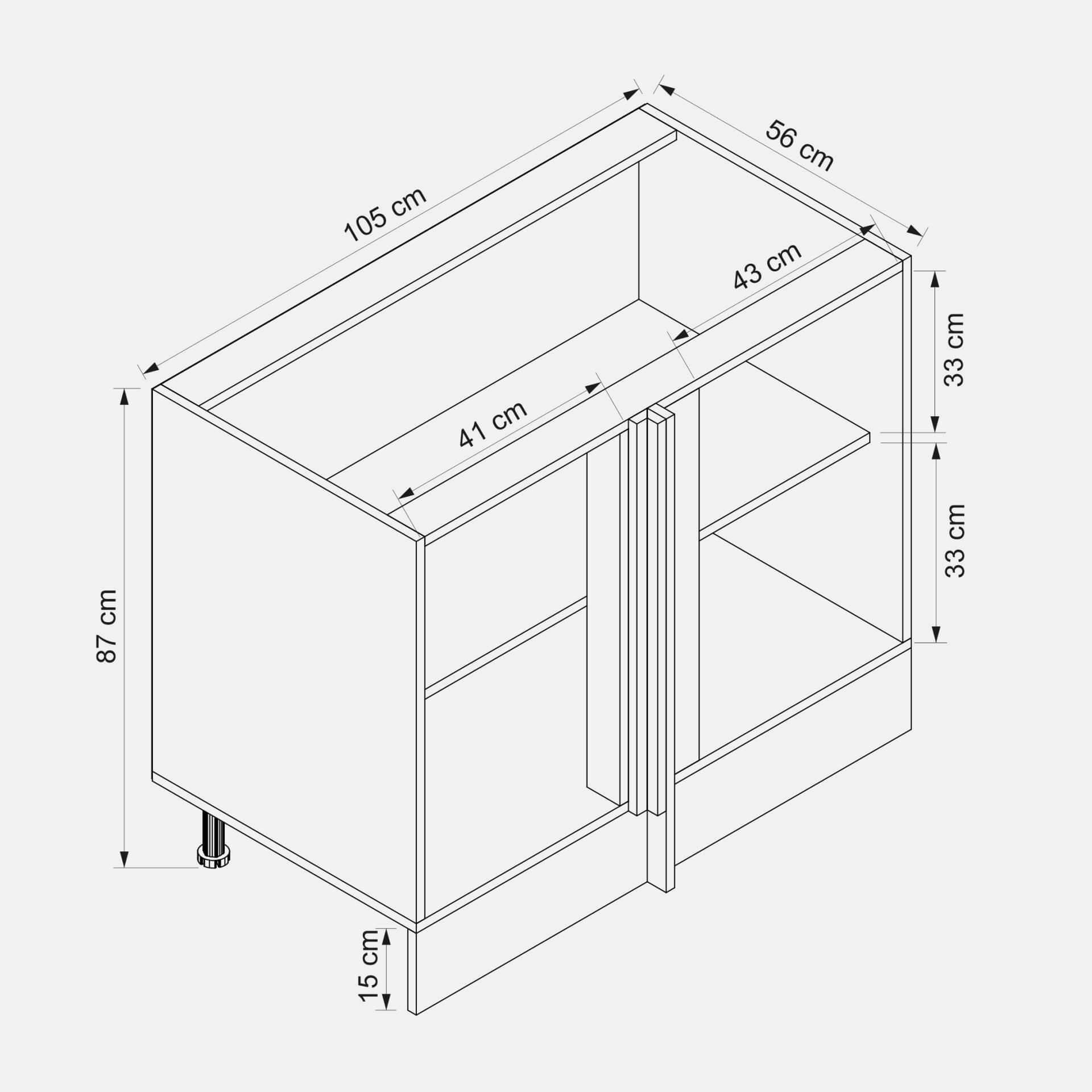 Köşe alt mutfak dolabı, mutfakta genellikle atıl kalan köşe alanlarını verimli şekilde değerlendirmek için tasarlanmıştır. Tezgâh altına uyumlu formu sayesinde köşe noktalarında maksimum depolama alanı sunar. Tencere, tava ve büyük mutfak gereçlerini düzenli biçimde saklamaya yardımcı olarak mutfakta kullanım kolaylığı sağlar.